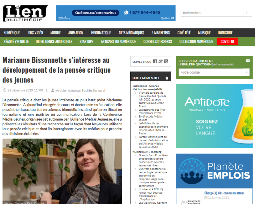 Le 21 décembre dernier, les travaux et intérêts de recherche de l’étudiante de l’EREST Marianne Bissonnette ont fait l’objet d’un article dans Lien MultiMédia. Bravo Marianne!