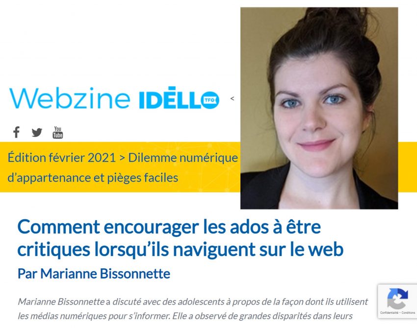 L’étudiante de doctorat et membre de l’EREST Marianne Bissonnette a récemment publié un article intitulé Comment encourager les ados à être critiques lorsqu’ils naviguent sur le web dans le webzine Idéllo. l’article propose des réflexions quant aux différentes avenues favorisant l’épanouissement de la littératie médiatique des adolescents. Bravo Marianne !